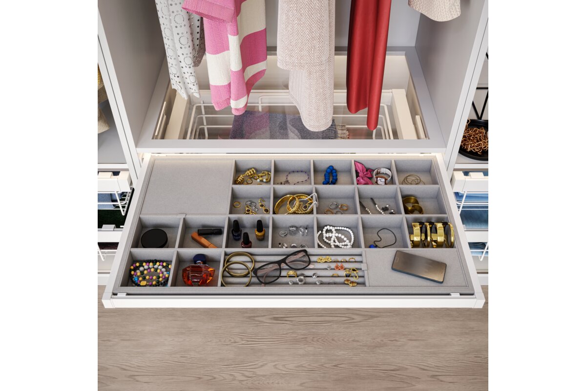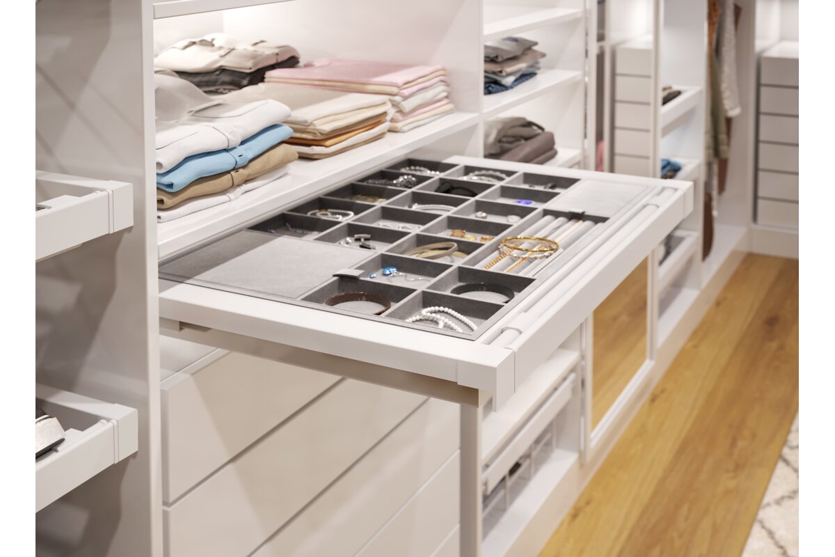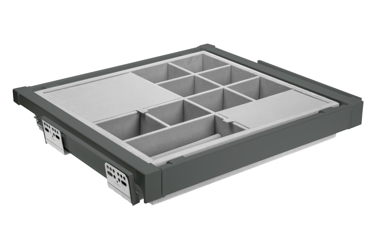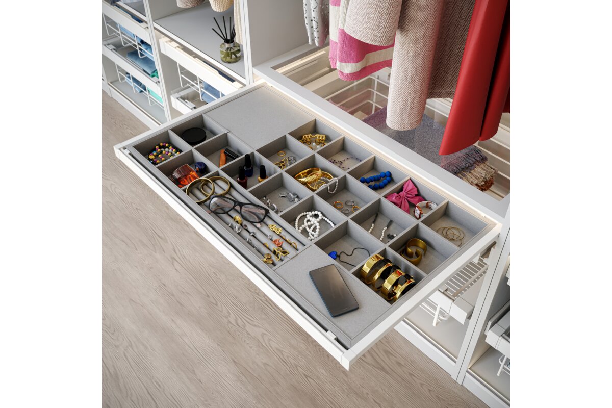 Sirtari i bizhuterive ELITE ka nje mbushje te bute prej pelhure dhe shume ndarje, fale te cilave mbron bizhuterite nga demtimi dhe siguron organizimin. Ndarjet me te vogla jane perfekte per ruajtjen e vatheve dhe unazave, ndersa ato me te medhat akomodojne lehtesisht aksesore te tille si aksesore flokesh ose syze dielli. Organizatori eshte i disponueshem ne tre variante ngjyrash dhe madhesish, me mundesi ne rregullim te gjeresise sipas trupit. Teknologjia e mbylljes se heshtur dhe hapja e plote lehtesojne perdorimin e perditshem te sirtarit. Seti eshte i pajisur me dy pjese udhezuesish montimi ne fund, dy pjese mbrojtese udhezuesish, dy pjese montimi per shporten, nje kornize me gjeresi te rregullueshme +/- 58 mm, nje sirtar me ndarje dhe vidat.