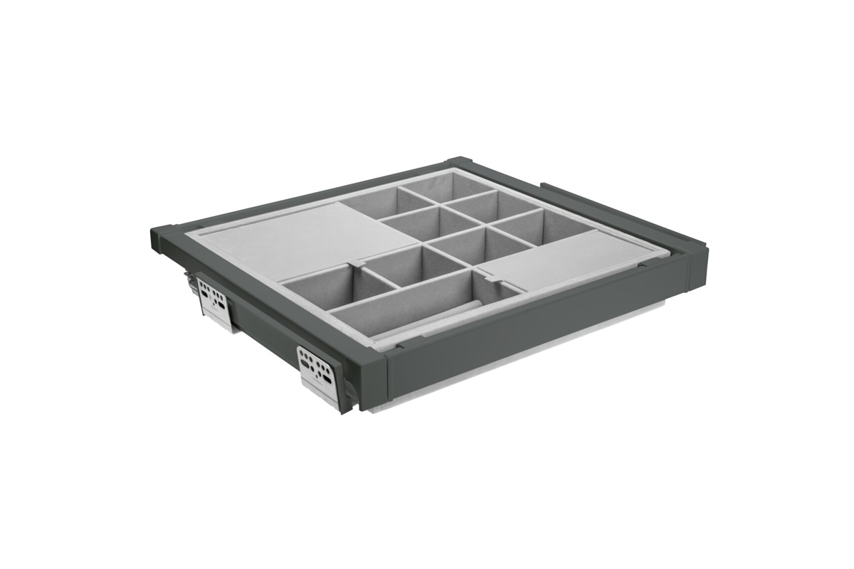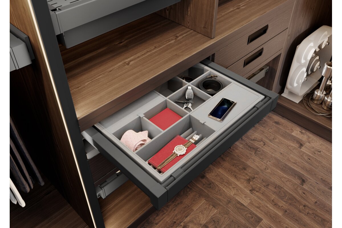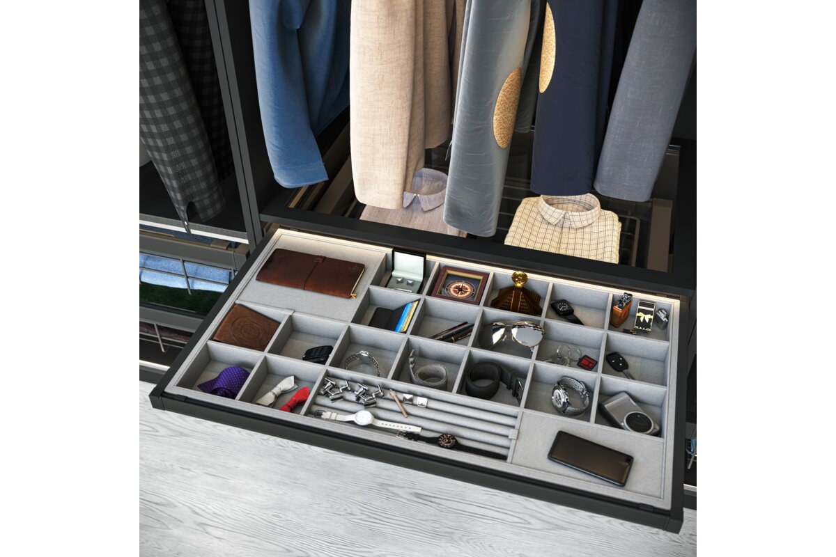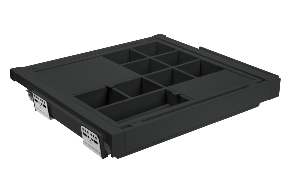 Sirtari i bizhuterive ELITE ka nje mbushje te bute prej pelhure dhe shume ndarje, fale te cilave mbron bizhuterite nga demtimi dhe siguron organizimin. Ndarjet me te vogla jane perfekte per ruajtjen e vatheve dhe unazave, ndersa ato me te medhat akomodojne lehtesisht aksesore te tille si aksesore flokesh ose syze dielli. Organizatori eshte i disponueshem ne tre variante ngjyrash dhe madhesish, me mundesi ne rregullim te gjeresise sipas trupit. Teknologjia e mbylljes se heshtur dhe hapja e plote lehtesojne perdorimin e perditshem te sirtarit. Seti eshte i pajisur me dy pjese udhezuesish montimi ne fund, dy pjese mbrojtese udhezuesish, dy pjese montimi per shporten, nje kornize me gjeresi te rregullueshme +/- 58 mm, nje sirtar me ndarje dhe vidat.